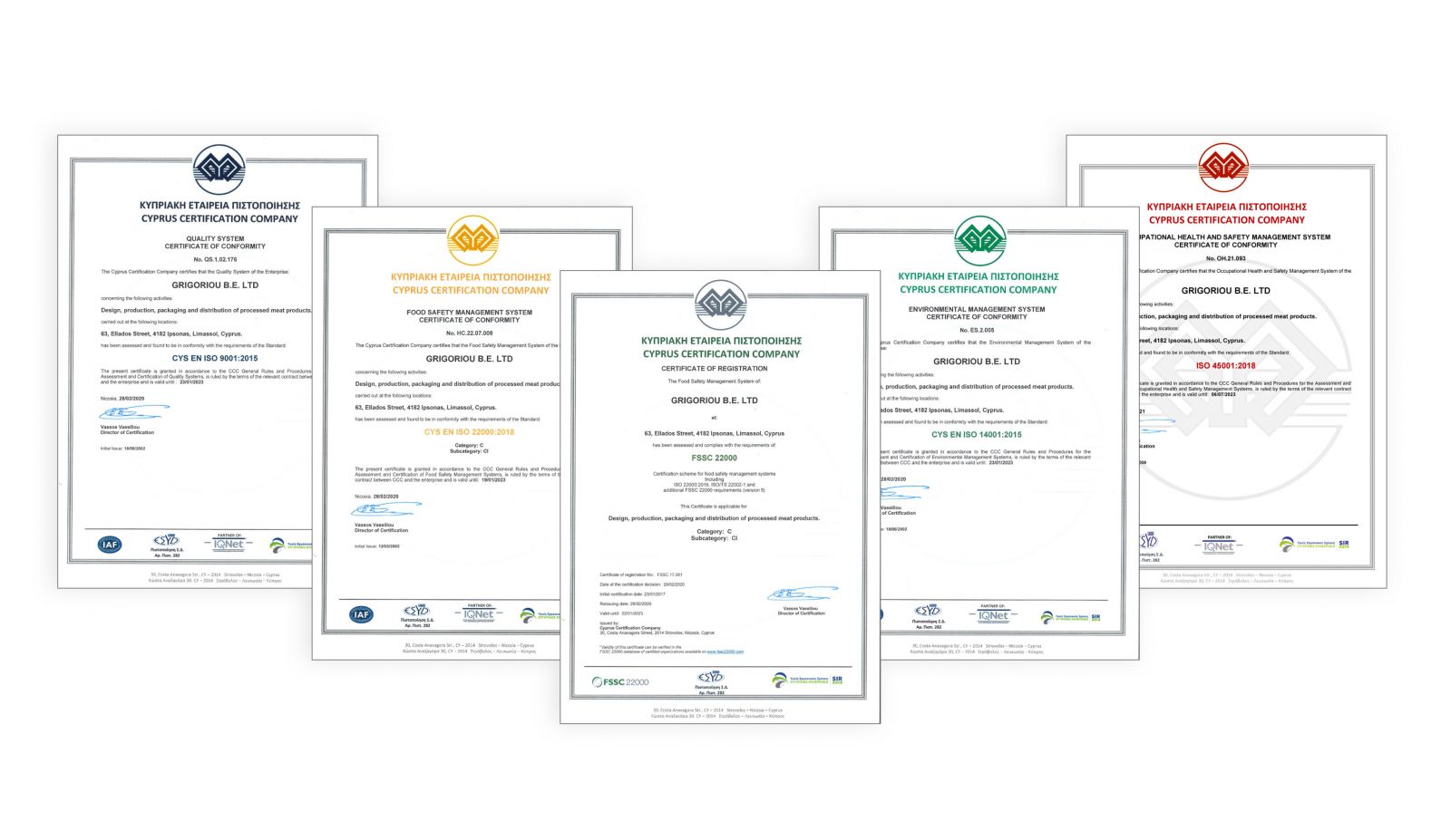 Η Γρηγορίου ήταν ίσως η πρώτη κυπριακή επιχείρηση που εφάρμοσε σύστημα HACCP το 1992. Το 2002, πρώτη απ' όλες τις κυπριακές εταιρείες, προχώρησε στην πιστοποίηση τριών συστημάτων διαχείρισης από τους διεθνώς αναγνωρισμένους οργανισμούς ΚΕΠ, ΕΛΟΤ και IQNET.